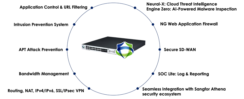 Sangfor Athena NGFW (เดิมรู้จักในชื่อ Sangfor Network Secure)มอบการปกป้องที่ครอบคลุมสำหรับทุกจุดเชื่อมต่อของเครือข่าย (network perimeter) เพื่อให้มั่นใจว่าสินทรัพย์ ข้อมูล และผู้ใช้งานที่มีค่าของคุณปลอดภัยจากภัยคุกคามรูปแบบใหม่